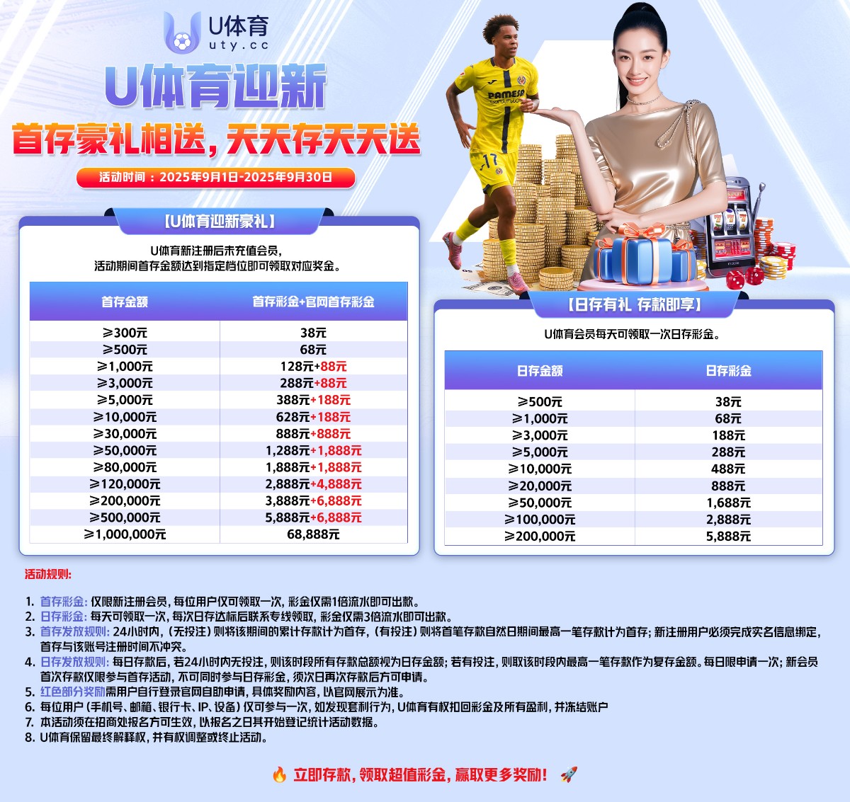 2.日存活动:日存500送38/1000送68/3000送188.本金一倍流水彩金3倍流水。